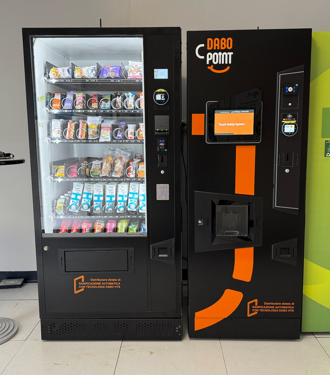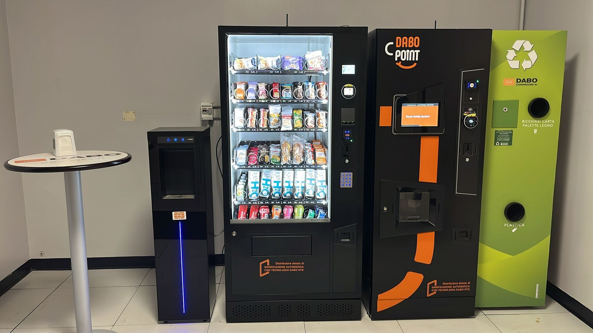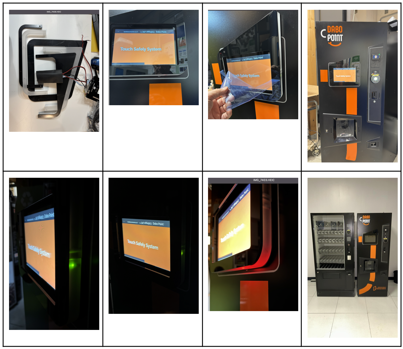 Evoluzione del nostro Touch Safely System: dalle cornici protettive predisposte in laboratorio, alla loro applicazione sul display touch, fino al risultato finale sui distributori automatici DABO Point. Il sistema crea una zona di utilizzo ben evidenziata e facilmente sanificabile, proteggendo l’area più toccata dagli utenti senza modificare il design della macchina. In questo modo il distributore diventa più sicuro, ordinato e professionale, e può essere aggiornato anche in retrofit su impianti già installati.