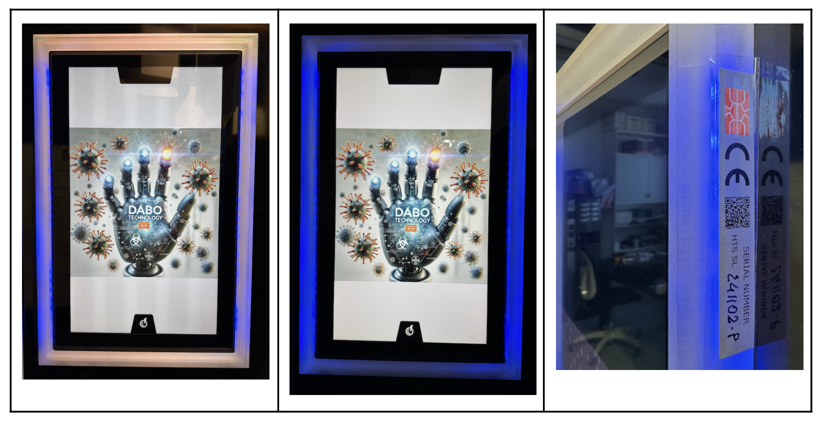 La cornice luminosa mette in evidenza l’area di contatto e integra la DABO Technology in un design ad alto impatto visivo, creando un evidente effetto “wow” che comunica subito sicurezza e innovazione. L’etichetta CE e il numero di serie garantiscono tracciabilità del dispositivo, rendendolo ideale per tutte le postazioni touch dove igiene e controllo sono requisiti fondamentali.